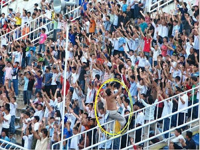 7、球迷协会有一胖哥们,每场比赛在看台必绕场一周,组织各看台球迷为浐灞加油。每到一看台,此处球迷齐喊:“脱!脱!脱!”,胖哥们随除去上身衣物,大家心满意足一阵热烈掌声,然后随他给浐灞加油助威。离开此看台时他再将短袖穿上。有图为证:8、原来看台上还有一哥们,扮《英雄儿女》中王成的样子:背后背电报机,头上缠绷带,带领大伙加油。今天看球hx问:“咦,传达室那个小伙咋没来?”,随被鄙视;