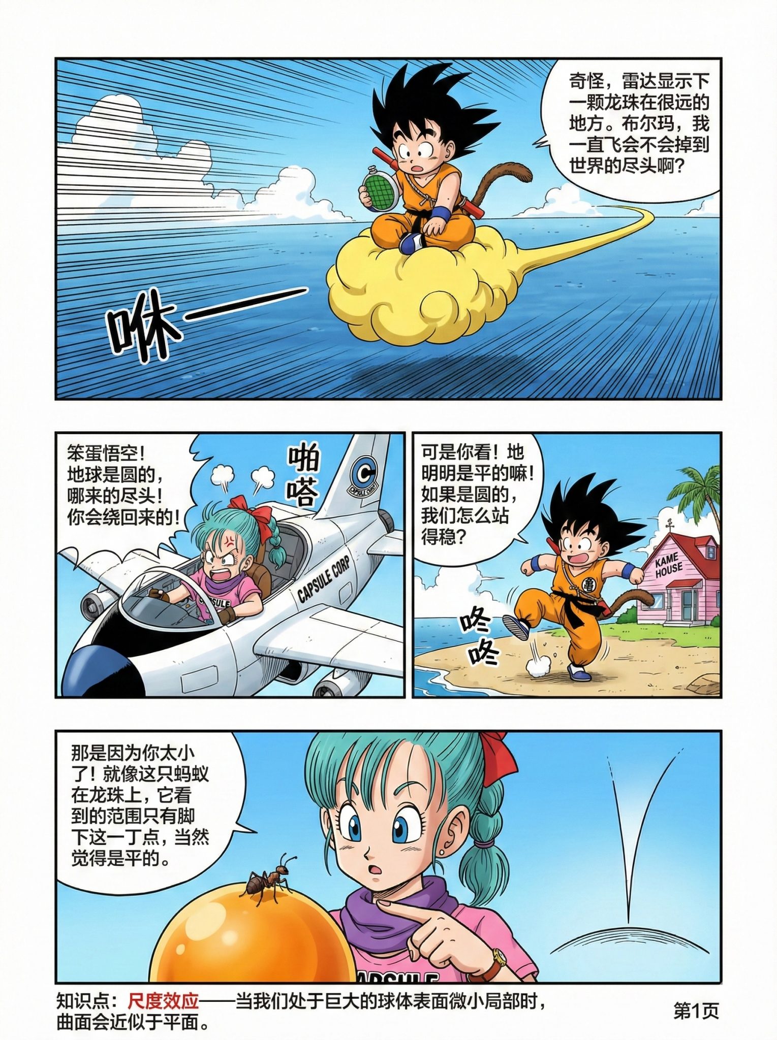 也许你已经习惯了让模型生成可互动的 HTML 页面来快速预览一个新知识,但这个方式对于孩子们学习知识来说还是不够生动。今天在 Twitter 上看到高手用 Nano Banana Pro 生成知识学习的漫画,效果非常出色: https://x.com/goldengrape/status/1993393532418330784 。刚好最近儿子在看漫画七龙珠,前两天又问”地球为什么是圆的?”,于是拿着原文的 prompt 尝试了一下,效果很棒。只是其中知识点的讲解不太全面,我和 GPT-5.1 请教后对 prompt 稍作改进,让其对知识的解构更完善一些。
